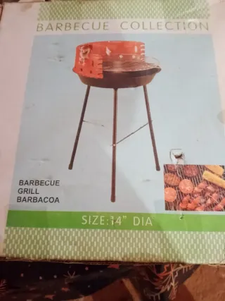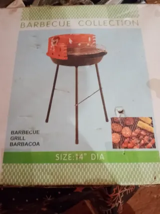 Parrilla de barbacoa portátil, ideal para exteriores. Su diseño permite una fácil preparación de comidas. - Diámetro de 14 pulgadas. - Estructura de metal con detalles en naranja. - Tapa de plástico resistente.
