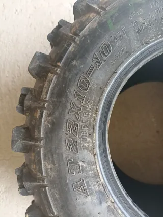Dos neumáticos Maxxis para moto de cross. - Medida: 22x10-10. - Diseño agresivo para terrenos difíciles.