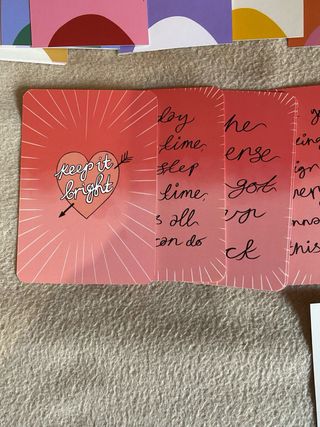Conjunto de cartas de afirmaciones para el crecimiento personal y la positividad. Incluye un folleto explicativo. - Diseño colorido y moderno. - Mensajes inspiradores en español y inglés. - Ideal para la reflexión diaria.