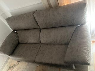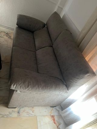 Sofá de tres plazas en color gris. Su diseño moderno y cómodo lo hace ideal para cualquier salón. - Tapicería de tela. - Cojines mullidos.