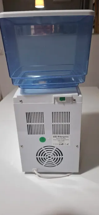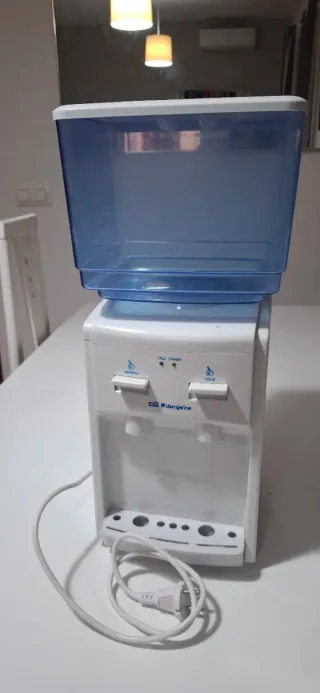 Dispensador de agua Orbegozo con depósito superior. - Diseño blanco y azul. - Dos grifos para agua fría y normal. - Indicadores luminosos de funcionamiento.