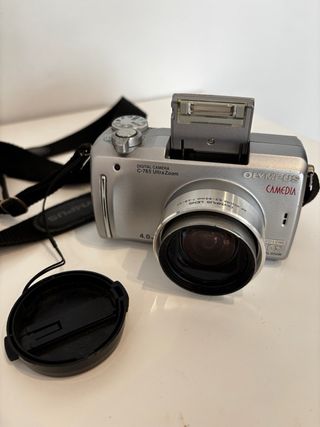 Cámara digital Olympus C-765 Ultra Zoom plateada y negra. - Zoom óptico 10x. - Zoom digital 40x. - Lente Olympus. Incluye: • Cámara • Batería • Cargador de batería • Cargador de electricidad • Tarjeta de memoria La cámara enciende, hace fotos y el zoom funciona bien. Tiene signos normales de uso por el tiempo, nada que afecte a su funcionamiento. Ideal como cámara sencilla, de iniciación o para quien quiera una cámara compacta con buen zoom.