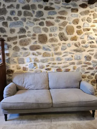 Sofá de tres plazas modelo Stocksund de IKEA. Su diseño atemporal se adapta a cualquier estilo de decoración. Tiene una mancha en la parte frontal, visible en las fotos. Se encuentra en un bajo accesible en coche hasta la puerta. - Tapicería de tela. - Color beige neutro. - Totalmente desenfundable y lavable a maquina.