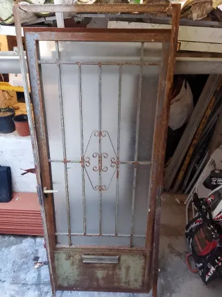 Puerta de hierro maciza con su marco. Diseño con rejas y cristal esmerilado. - Incorpora un buzón. - Tirador metálico. Puerta hierro maciza con pestillo y llaves lista para poner con marco 81,5 ancho x 197,5alto En buen estado Teléfono y WhatsApp;658334017
