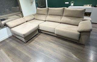 Sofá amplio y cómodo en color beige / arena claro, de estilo moderno y bien conservado. Cuenta con asientos extraíbles, respaldos acolchados y una parte movible tipo chaiselongue, ideal para adaptarlo al espacio o tumbarse. Incluye dos taburetes integrados en la estructura, perfectos como asientos extra o reposapiés. El sofá está en buen estado general, sin roturas ni daños en la tapicería. Únicamente tiene el enganche metálico que une las dos partes roto / suelto (ver foto). No afecta al uso diario y puede repararse fácilmente. Se vende por cambio de decoración. Solo recogida por parte del comprador.