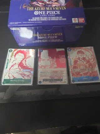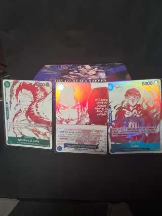Conjunto de tres cartas del juego de cartas coleccionables One Piece tcg con artes alternativos - Carta de Monkey D. Luffy. - Carta de Sabo. - Carta de personaje con arte de Shanks. - Incluye la caja de The Azure Sea's Seven.