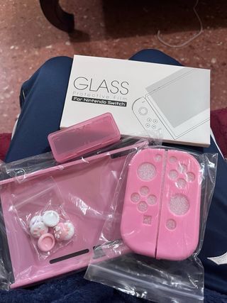 Set de accesorios en color rosa para Nintendo Switch. Incluye: -1 protector de pantalla de vidrio -Caja de almacenamiento para 4 juegos -Funda Nintendo Switch Rosa -Grips para joysticks -1 PARCHE DE REGALO!!! ⏰⏰⏰ ENVÍO 24/48h. !!!!! Todo nuevo, sin abrir! ACEPTO OFERTAS!