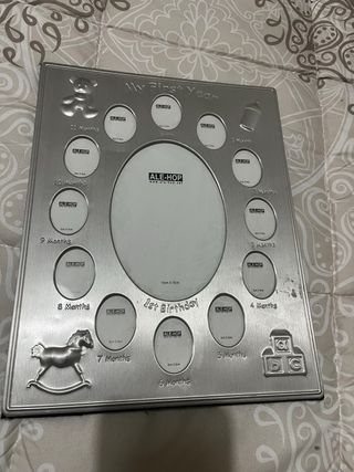 Marco de fotos plateado para celebrar el primer año de un bebé. Tiene espacio para 12 fotos de meses y una foto central. - Diseño con osito, caballito balancín y bloques ABC. - Incluye texto My First Year y 1st Birthday. - Medidas foto central: 10cm x 15cm.
