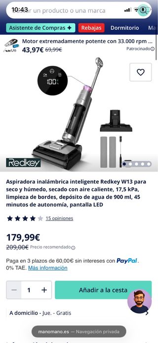 Aspirador inalámbrico Redkey W13 para seco y húmedo. Diseño moderno y funcional. - Motor potente con 33.000 rpm. - Secado con aire caliente. - Limpieza de bordes. - Depósito de agua de 900 ml. - 45 minutos de autonomía. - Pantalla LED.