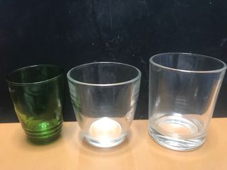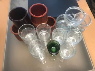 Conjunto variado de recipientes, incluyendo vasos de cristal y tazas de cerámica. - Vasos de cristal transparente. - Tazas de cerámica en tonos marrón y terracota. - Unos vasos pequeño de cristal verde. -Incluye: • 3 vasos chupito (color verde) • 6 vasos cafe (marca duralex) • 7 vasos cortado (italy) • 5 tarrina (para natilla o salsas) • 5 vasos terracota ( para carajillo)