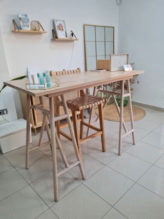 Mesa alta y 1 taburetee de madera.