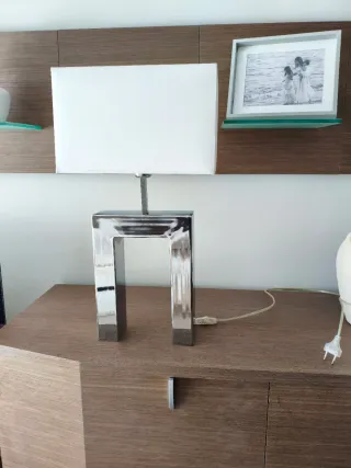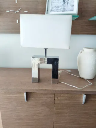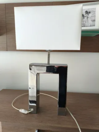 Elegante lámpara de mesa con un diseño contemporáneo. - Base y estructura de metal brillante. - Pantalla de tela blanca. - Ideal para mesitas de noche o escritorios.