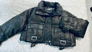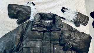 Chaqueta de invierno con un diseño moderno y llamativo. Viene con un cinturón con guantes incluidos - Material con efecto piel. - Cuello alto. - Bolsillos frontales con solapa y hebilla. - Puños ajustables con hebilla.