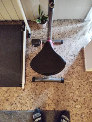 Cinta de correr magnética en buen estado. - Diseño compacto y funcional. - Superficie de carrera negra. - Estructura blanca y manillar negro.