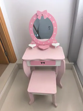 Conjunto de tocador infantil con espejo y taburete a juego. - Diseño con detalles de corazones y lazos. - Incluye un pequeño cajón. - Acabado en colores rosa y blanco.