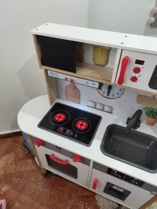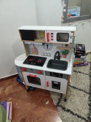 Divertida cocina de madera para que los más pequeños jueguen a ser chefs. - Incluye horno, microondas y fogones. - Grifo y fregadero. - Estanterías para guardar accesorios. Accesorios..altura 100cm .largo 77 cm .ancho 30cm..con luces y ruidos .como nueva .se entrega desmontada y en su caja original