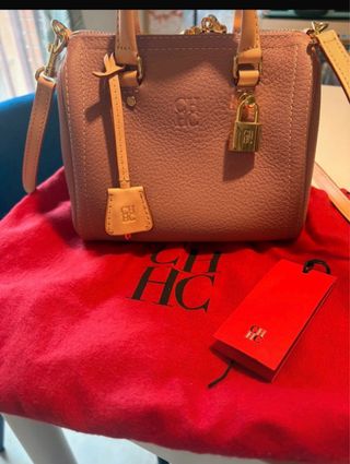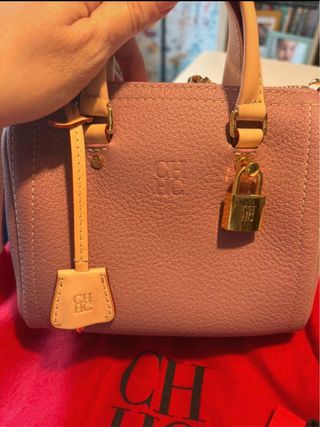 Bolso de mano Carolina Herrera en color rosa con detalles dorados. Incluye candado y etiqueta. - Material: Piel texturizada. - Cierre de cremallera. - Asa corta y correa ajustable. - Logo grabado en el bolso y en los accesorios.