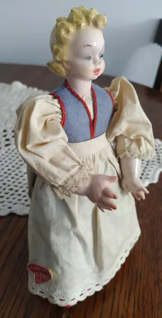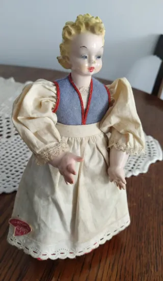 Preciosa muñeca antigua de porcelana con vestido tradicional. - Vestido de tela con detalles bordados. - Cabello rubio. - Etiqueta de marca en el bajo del vestido.