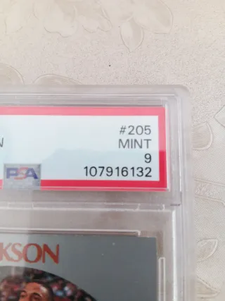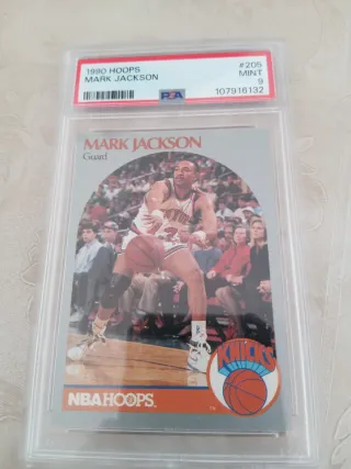 Tarjeta de baloncesto de Mark Jackson de la colección 1990 Hoops. - Grado PSA 9 (Mint). - Tarjeta #205. - Jugador: Mark Jackson, posición Guard. - Equipo: New York Knicks.