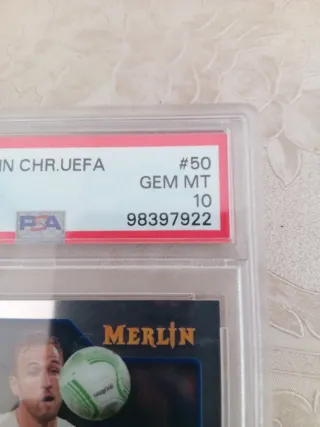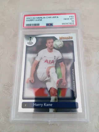 Carta coleccionable de Harry Kane de la temporada 2021/22. - Serie: Merlin Chrome UEFA. - Grado: GEM MT 10. - Número de serie: 98397922. - Jugador: Harry Kane. - Equipo: Tottenham Hotspur. - Evento: Europa Conference League.