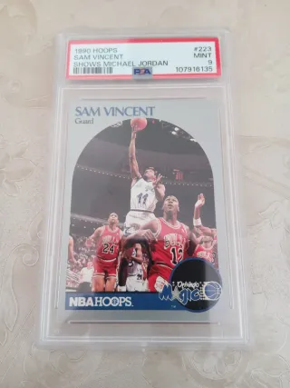 Tarjeta de baloncesto de 1990 Hoops, con Sam Vincent y Michael Jordan. - Tarjeta PSA Graded 9 Mint. - Número de serie 107916135. - Incluye a Michael Jordan.