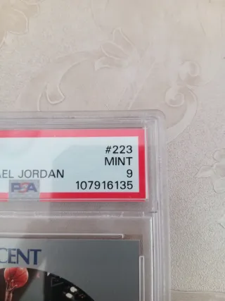 Tarjeta de baloncesto de Michael Jordan de la colección 1990 Hoops. - Graduada por PSA con una puntuación de 9 (Mint). - Incluye el número de serie de autenticación 107916124. - Muestra a Michael Jordan en acción con el uniforme de los Chicago Bulls.