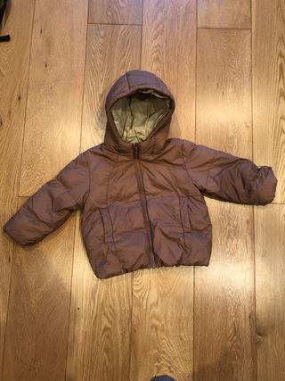 Chaqueta de invierno de la marca Zara, ideal para niños de 2 a 3 años. Es reversible y tiene capucha. - Color marrón. - Cierre de cremallera. - Bolsillos laterales.