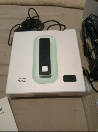 Robot eléctrico diseñado para la limpieza de cristales. Su diseño es blanco y cuenta con un panel de control central. - Panel de control con botón de encendido. - Indicador LED. - Incluye cables de conexión y botella pulverizadora.