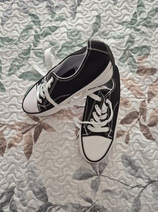 Vendo un par de zapatillas estilo Converse. Son negras con detalles blancos. Ideales para un look casual. - Están en buen estado. - Son cómodas y ligeras. - Perfectas para el día a día.