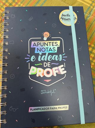 Planificador de la marca Mr. Wonderful, diseñado para profesores. - Título: Apuntes, Notas e Ideas de Profe. - Incluye pegatinas. - Cierre con goma elástica. - Diseño con iconos temáticos.