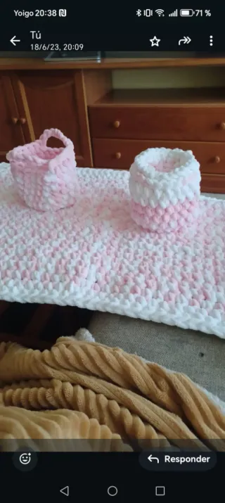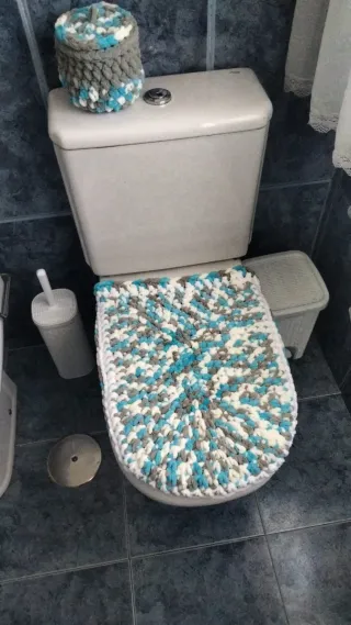 Conjunto de accesorios para el baño hechos a mano con lana de terciopelo. - Incluye funda para tapa de WC y funda para rollo de papel. - Diseño multicolor con tonos grises, blancos y azules. - Textura suave y mullida.