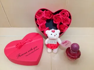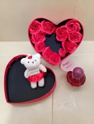 LEER DESCRIPCIÓN COMPLETA 👇 Set Especial San Valentín 💕 Contiene: - Caja en forma de corazón con rosas rojas artificiales. En la caja pone: "Forever with you" ("Para siempre contigo") Mide unos 16cm. En su interior, entre las rosas hay un tierno osito de felpa color marfil con un letrero en su pecho que pone: "I LOVE YOU" - Frasco de perfume con tapa morada. Colonia para mujer (Eau de toilette) Un precioso frasco de colores malvas y rosados de 50ml. El bote mide: Alto(contando el tapón) 8cm. Ver fotos ampliando imágenes del anuncio. ‼️PRECIO NO NEGOCIABLE.