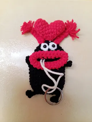 LEER DESCRIPCIÓN COMPLETA! 👇 Llavero muy original hecho a mano con técnica de crochet. Diseño de un adorable monstruo color negro, tiene unas simpáticas trenzas rojas a juego con su gran boca, además lleva un tierno corazón rojo sobre su cabeza. Es muy útil! ya que se pueden meter las llaves dentro del monstruo por su boca ó usarlo como monedero etc... MEDIDAS: -Alto 9 cm. -Alto (contando trenzas) 13 cm. -Ancho 6 cm. NUEVO! Ver fotos ampliando imágenes del anuncio. ❗PRECIO NO NEGOCIABLE.