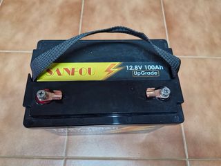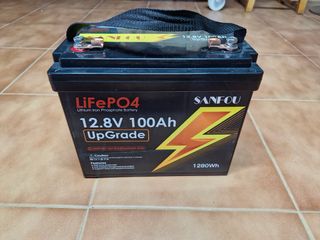 Batería de litio LiFePO4 de 12.8V y 100Ah de la marca SANFOU. - Capacidad: 100Ah - Voltaje: 12.8V - Marca: SANFOU - Asa de transporte integrada
