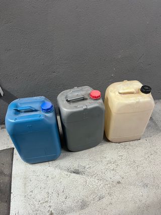 Se venden tres bidones de plástico de 25 litros cada uno. Son ideales para almacenar líquidos. 20 € bidon por separado - Bidón azul con tapa azul. - Bidón gris con tapa roja. - Bidón beige con tapa negra