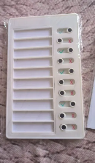 Organizador de tareas con un diseño práctico para llevar un control de tus actividades. Incluye un set de tarjetas. - 12 casillas para tareas. - Indicadores de 'check' y 'X' para marcar el progreso. - Material blanco resistente. Recambios de hojas para organizar diferentes tareas
