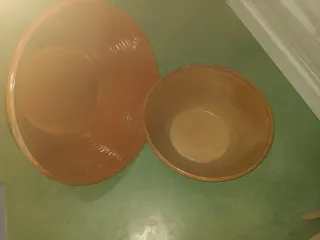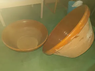 Se venden dos baños grandes de barro. Útiles para matanzas. - Material: Barro cocido. - Color: Tonalidades marrones y ocres. - Acabado interior esmaltado.