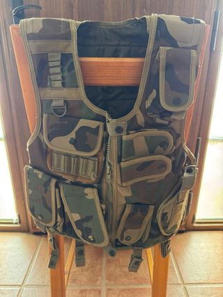 Chaleco táctico de camuflaje, ideal para airsoft o actividades al aire libre. - Diseño con múltiples bolsillos. - Cierre frontal con cremallera. - Tirantes ajustables.