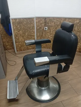 Sillón de barbero hidráulico de estilo clásico, diseñado para uso profesional. - Tapicería de cuero negro. - Base redonda de metal. - Reposapiés metálico. - Reposacabezas ajustable.