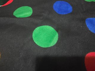 Retal divertido con estampado de lunares de colores sobre fondo negro. Ideal para fiestas temáticas o eventos. - Diseño de lunares multicolor. - Fondo negro. - 1 m x 1.10cm