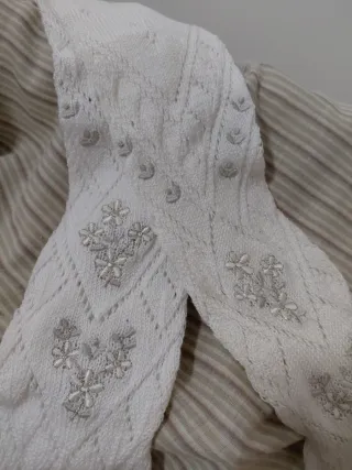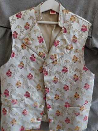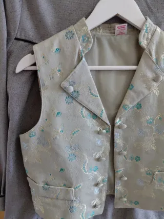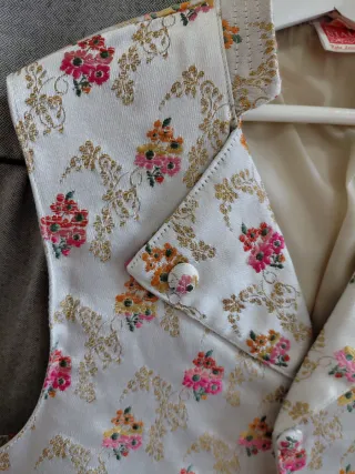 Chaleco de talla 44, ideal para niño de 12 años. - Diseño tradicional fallero. - Tejido blanco con estampado floral y detalles dorados. - Botón central. - Cuello y solapa decorados.