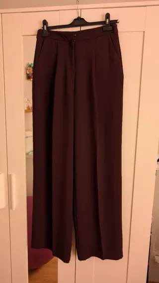 Pantalones de vestir de corte ancho en color burdeos. - Cintura alta. - Bolsillos laterales. - Cierre de cremallera y botón.