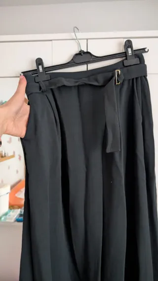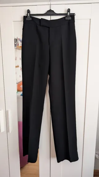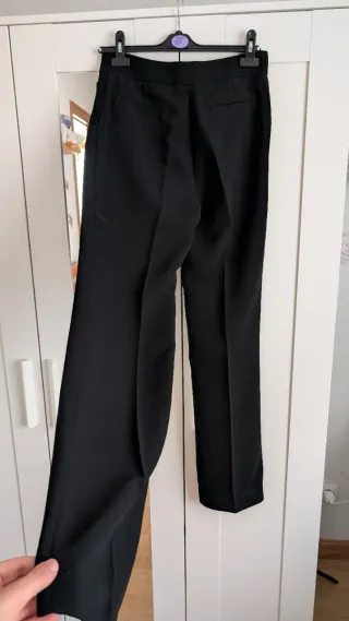 Pantalones negros de vestir, ideales para un look formal. - Cintura con trabillas. - Cierre de cremallera y botón. - Bolsillos laterales.
