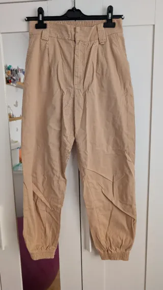 Pantalones de color beige con cintura elástica y bajos ajustados. - Diseño con pinzas en la parte delantera. - Bolsillos laterales. - Tejido de pana.