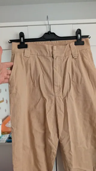 Pantalones de vestir de color beige, con un corte ancho y moderno. - Cintura alta con trabillas. - Cierre de cremallera y botón. - Bolsillos laterales. - Pinzas delanteras.