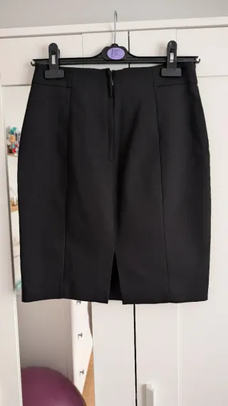 Falda negra de corte clásico. - Cremallera lateral. - Diseño liso.