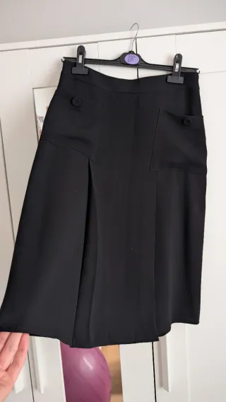 Falda negra de corte midi con detalle de bolsillos. - Dos bolsillos frontales con botón. - Diseño con pinzas. - Cintura alta.
