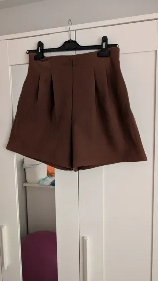 Pantalones cortos de color marrón con un diseño elegante y moderno. Perfectos para un look casual o más arreglado. - Tejido de color marrón. - Detalle de pliegues en la parte delantera. - Cintura alta.