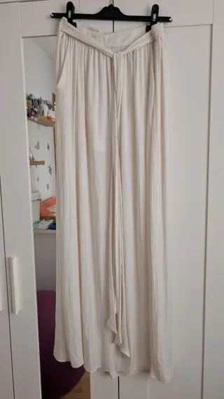 Falda de tela color beige, con un diseño ancho y fluido. Incluye un cinturón a juego para anudar en la cintura. - Cintura elástica. - Bolsillos laterales. - Tejido ligero.