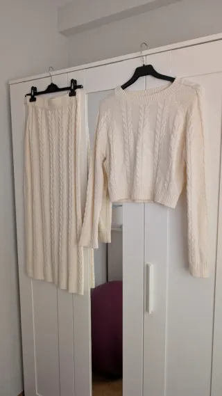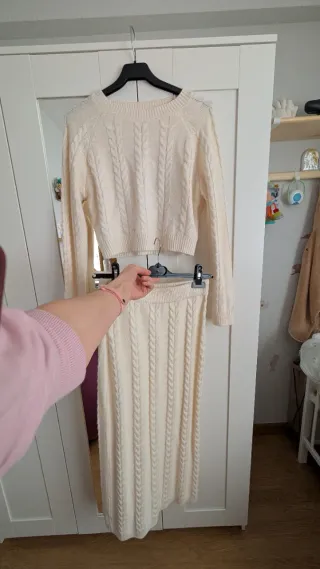 Conjunto de dos piezas de punto en color crema. El jersey es de manga larga y la falda es larga. - Jersey con trenzas. - Falda con trenzas.